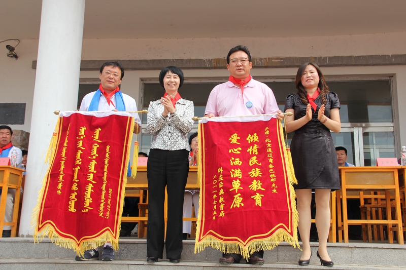 通遼市教育局授予“傾情民族教育 愛心灑滿草原”錦旗。巴根那表示,他會一直關注、資助教育事業(yè),擔負起一定的社會責任,以愛心回報家鄉(xiāng)!