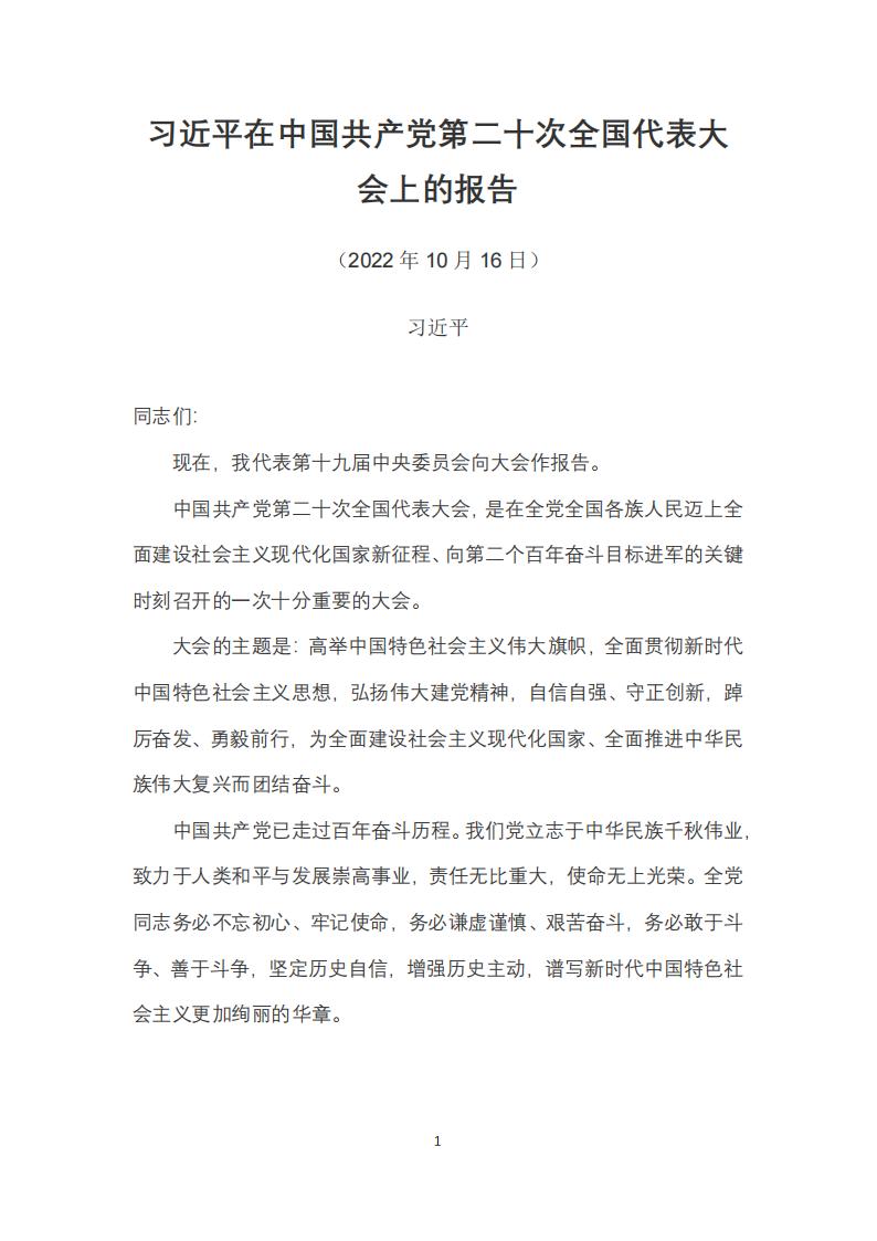 習近平在中國共產(chǎn)黨第二十次全國代表大會上的報告